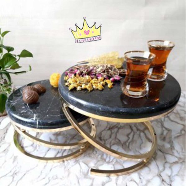 استند پذیرایی دو طبقه سنگی پایه گوشواره‌ای نقره‌ای سنگ مشکی خط سفید