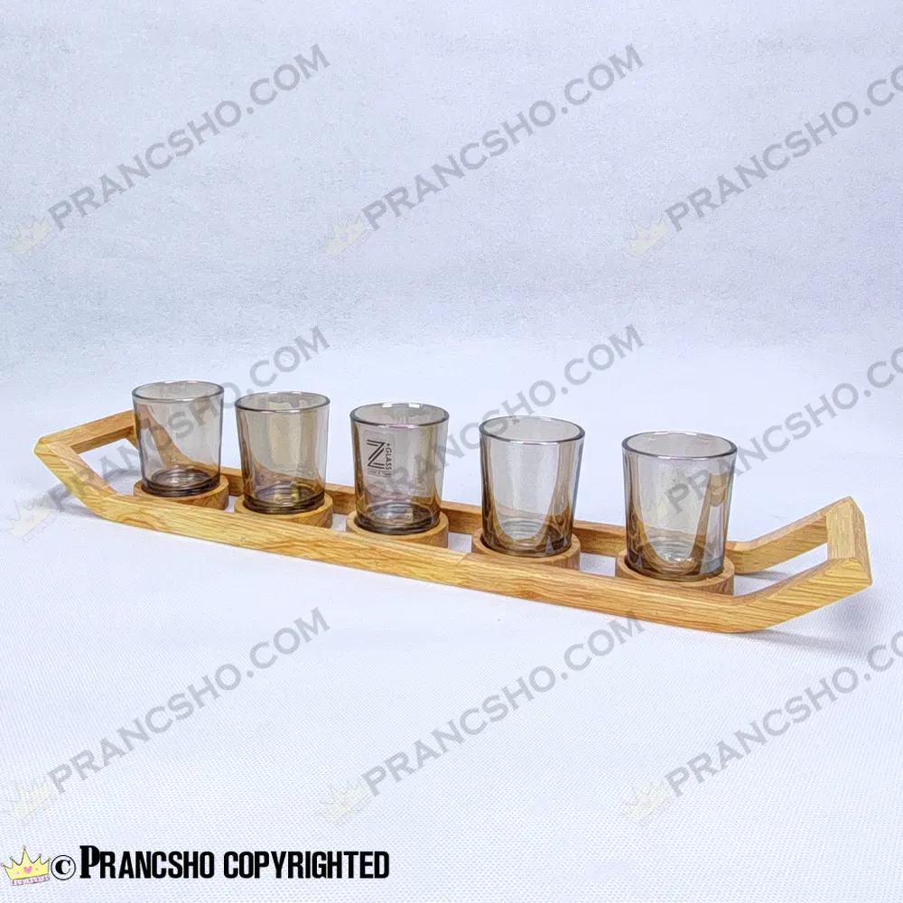ست شات شامپاینی و شمعدان 5 عددی با استند چوبی