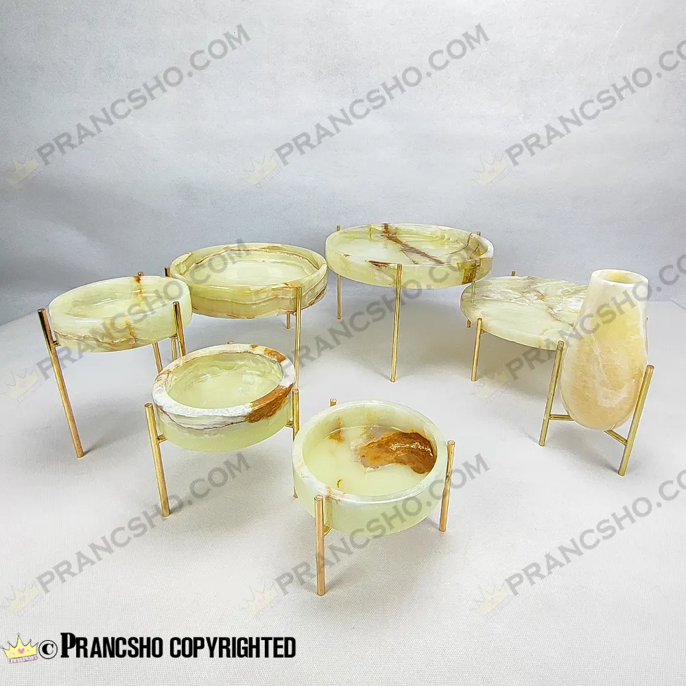 ست ظروف پذیرایی سنگی پایه میخی طلایی سنگ مرمر نباتی قهوه‌ای