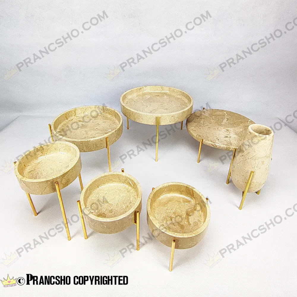 این محصول شامل 7 ظرف پذیرایی سنگی و 7 پایه میخی فلزی آبکاری فورتیک می باشد