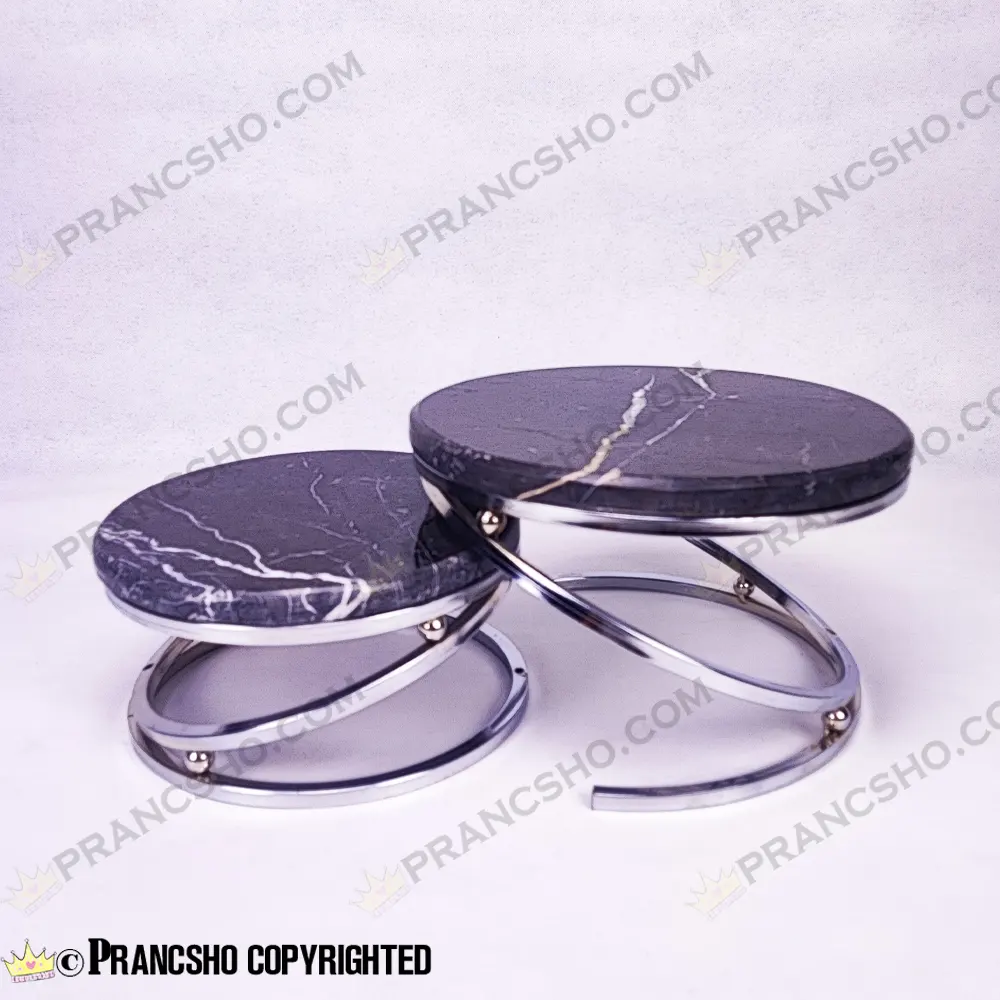 استند پذیرایی دو طبقه سنگی پایه گوشواره‌ای نقره‌ای سنگ مشکی خط سفید